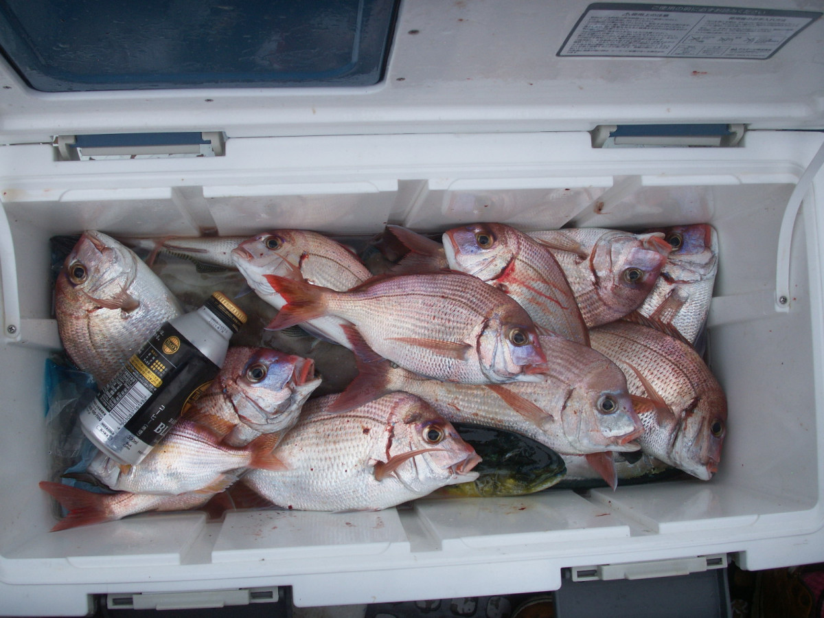 船釣初めてのお客さんマダイ38~63cm5匹他マアジ、チダイ、レンコ、ハゲ、ちかめ金時、魚の食いが…
